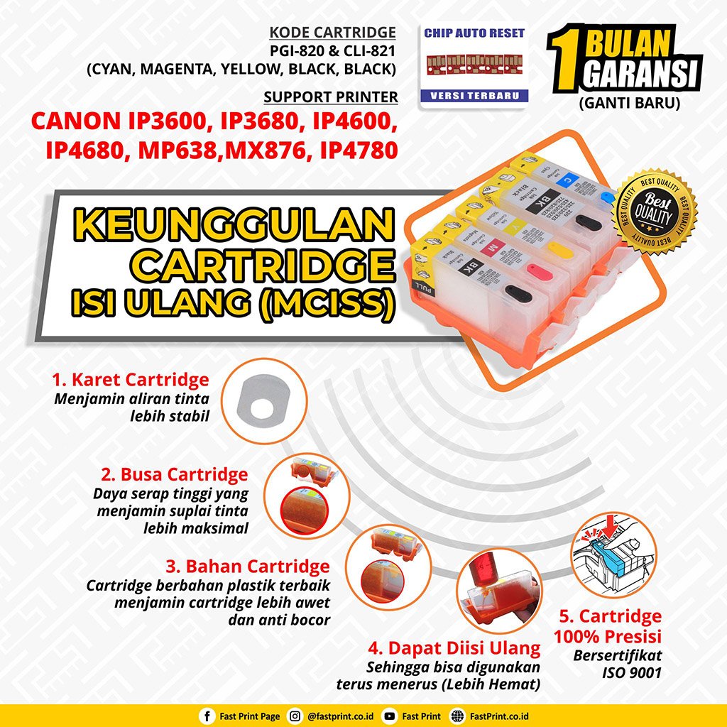 - Support Tipe Cartridge: CLI-821 & PGI-820 (Cyan, Magenta, Yellow, Black, Black).