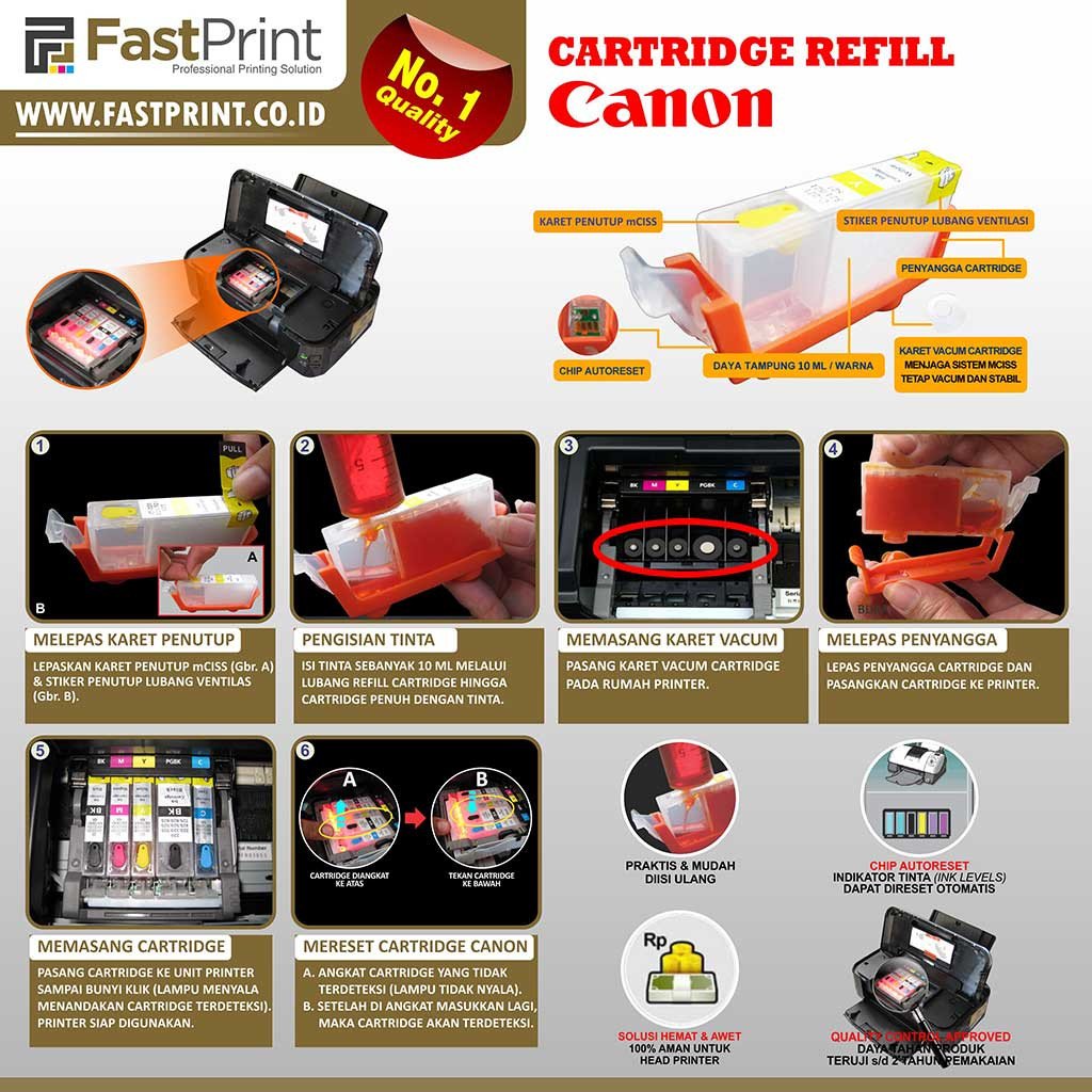 Gunakan tinta Fast Print untuk menjaga keawetan Head Printer dan hasil cetak selalu maksimal, keunggulan tinta Dye Based Photo Premium Fast Print untuk Canon: