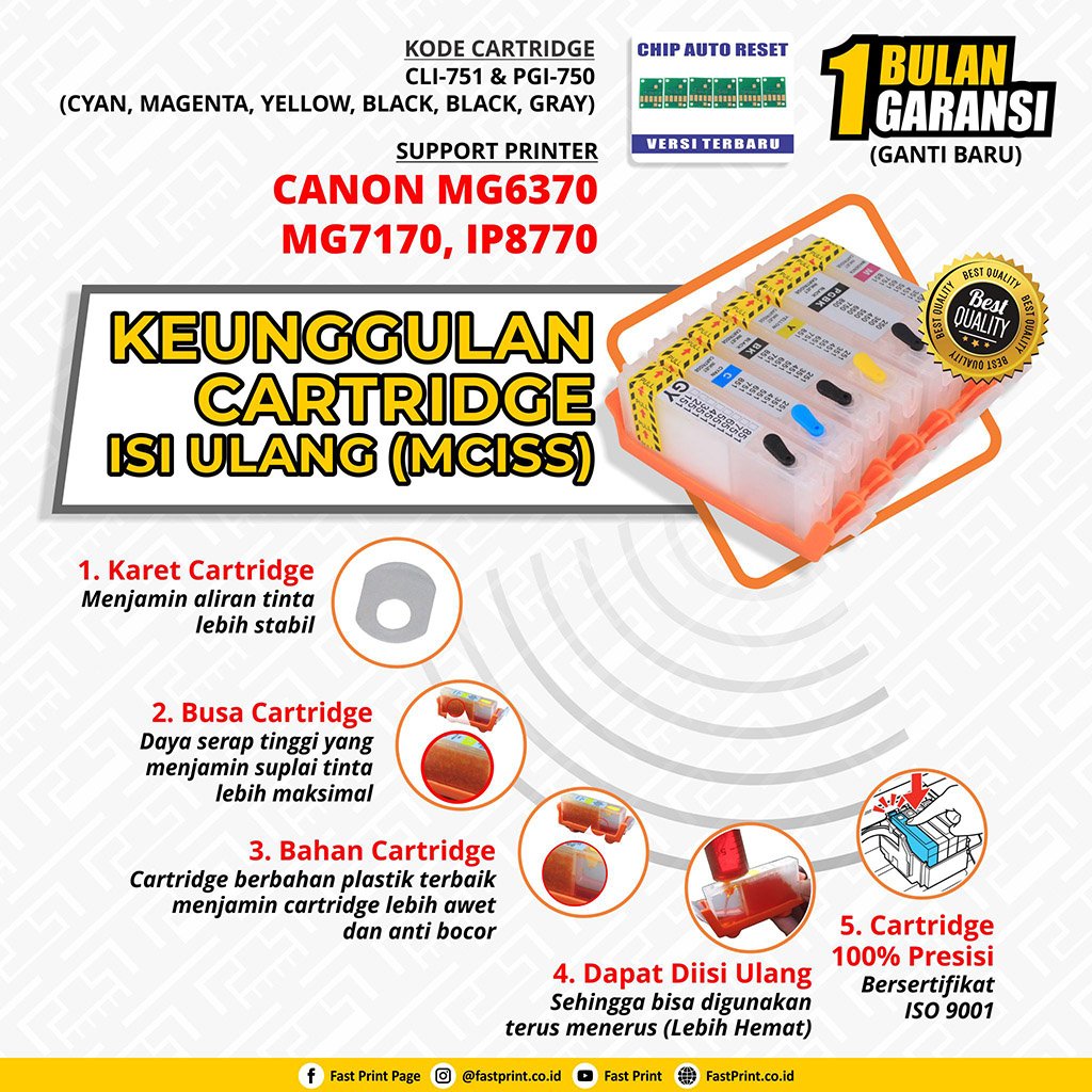 - Support Tipe Cartridge: CLI-751 & PGI-750 (Cyan, Magenta, Yellow, Black, Black, Gray).