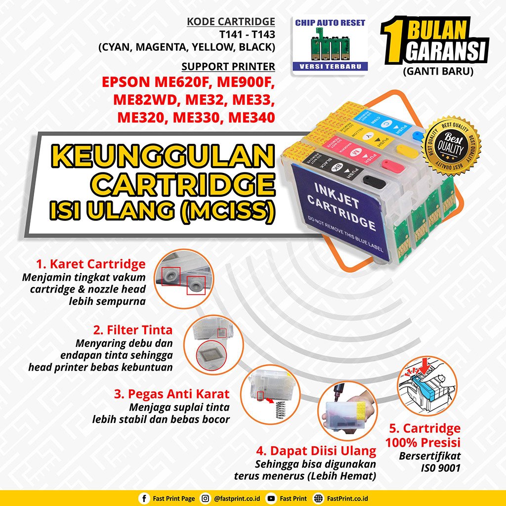 Cartridge MCISS Fast Print menggunakan Chip Auto Reset sehingga dapat terus digunakan. Sebaliknya Cartridge Original menggunakan sistem sekali pakai, sehingga saat indikator tinta habis Anda harus membeli cartridge baru lagi yang harganya jauh lebih mahal.