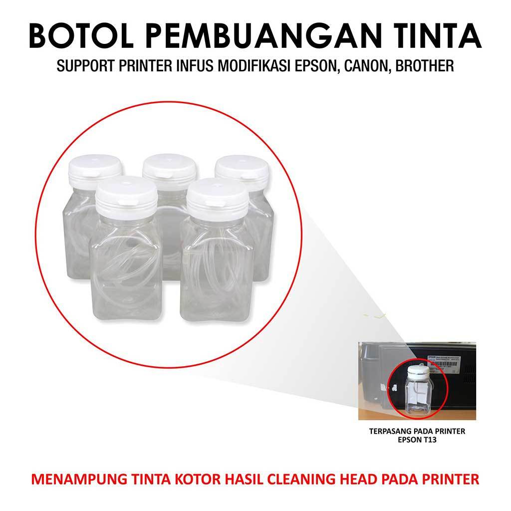 Botol serbaguna dengan warna transparan cocok digunakan untuk menampung tinta kotor hasil cleaning head printer. Dengan menggunakan botol pembuangan, printer Anda dijamin bebas kebanjiran tinta karena tinta kotor langsung masuk ke botol pembuangan, tidak tersimpan ke dalam busa dalam printer.