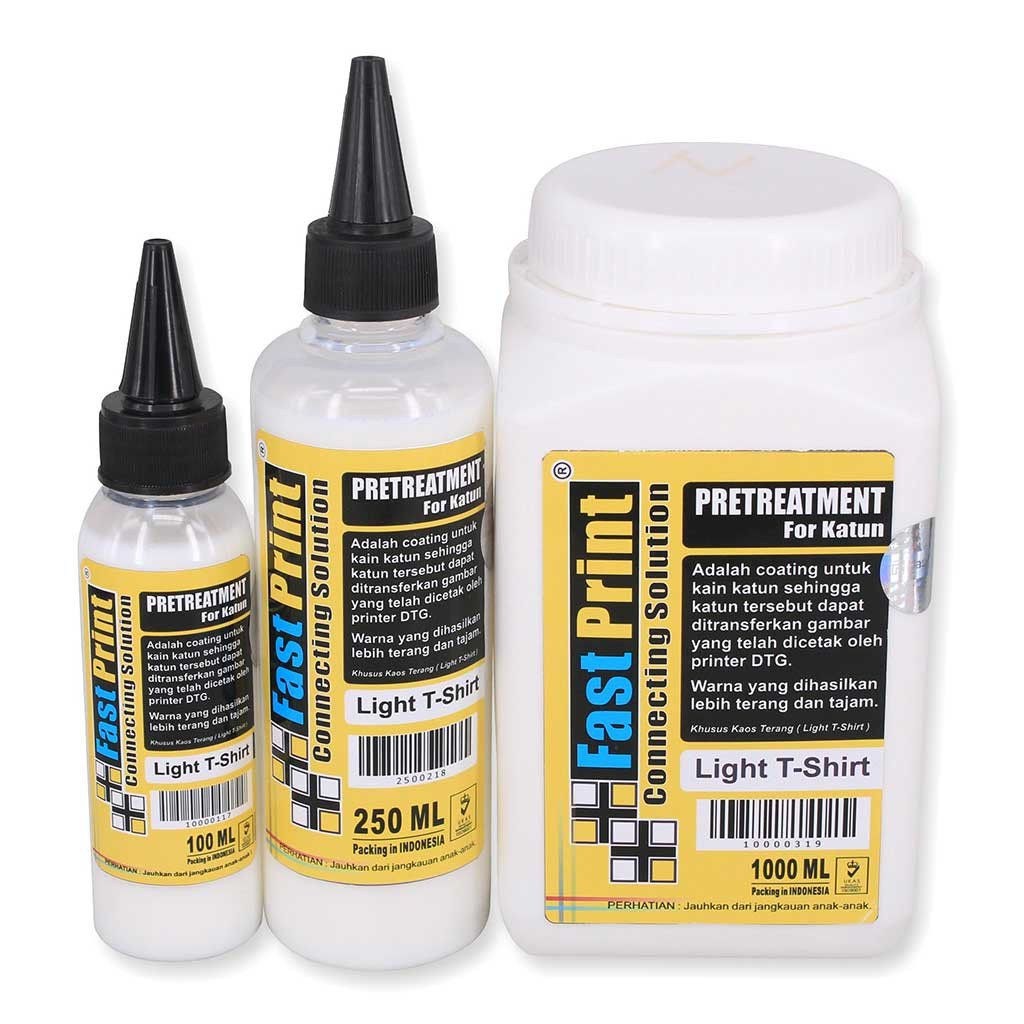 Pretreatment adalah cairan khusus yang digunakan pada kain kaos katun dan lainnya yang akan dicetak dengan Printer DTG atau sebagai media dengan Transfer Paper. Pretreatment ini hanya untuk kaos yang berwarna cerah atau putih. Dengan menggunakan cairan pretreatment ini hasil cetak pada kaos akan lebih memuaskan, ketajaman dan kepekatan warna akan terlihat dibandingkan jika tidak menggunakan cairan pretreatment. Sehingga Anda mampu mendapatkan hasil terbaik dengan menggunakan Cairan Pretreatment Khusus DTG.
