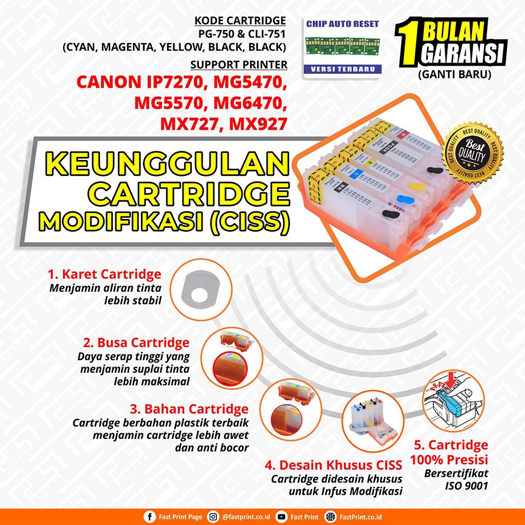 - Support Tipe Cartridge: PG-750 & CLI-751 (Cyan, Magenta, Yellow, Black, Black).
